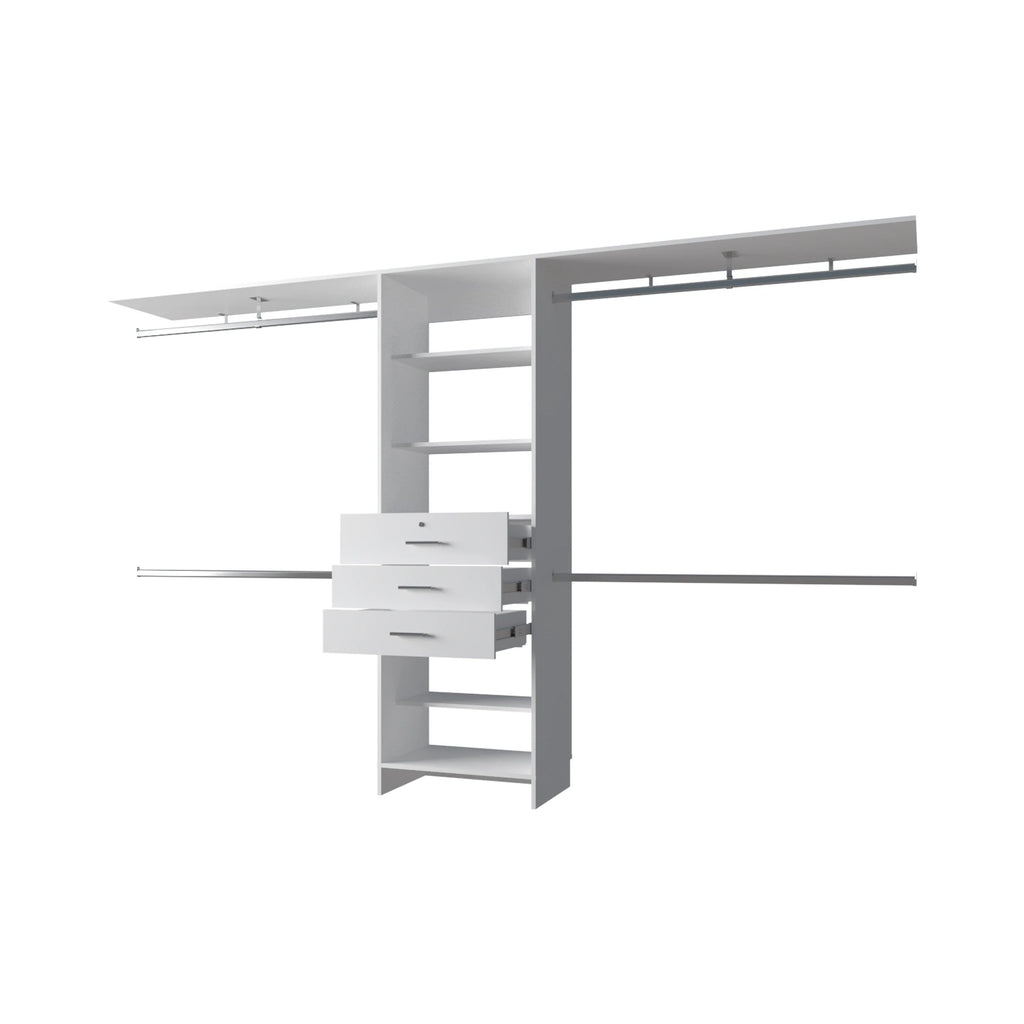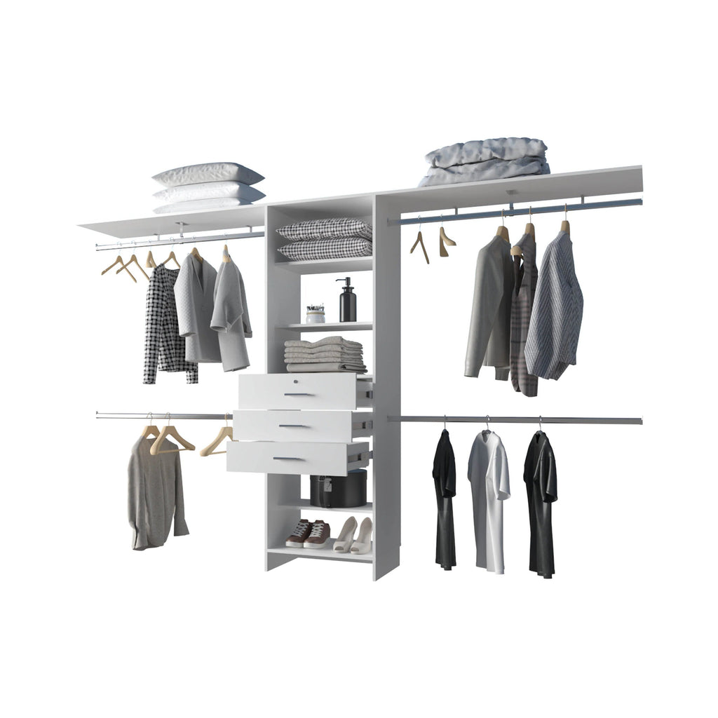 Designed to maximize efficiency and blend with any decor, this versatile modular closet organizer system features multiple hanging rods, a central shelving unit, drawers, and a full-length top shelf, creating a well-organized space. Ideal for walk-in closets or bedrooms, this system offers a custom storage solution that combines practicality, elegance, and durability.