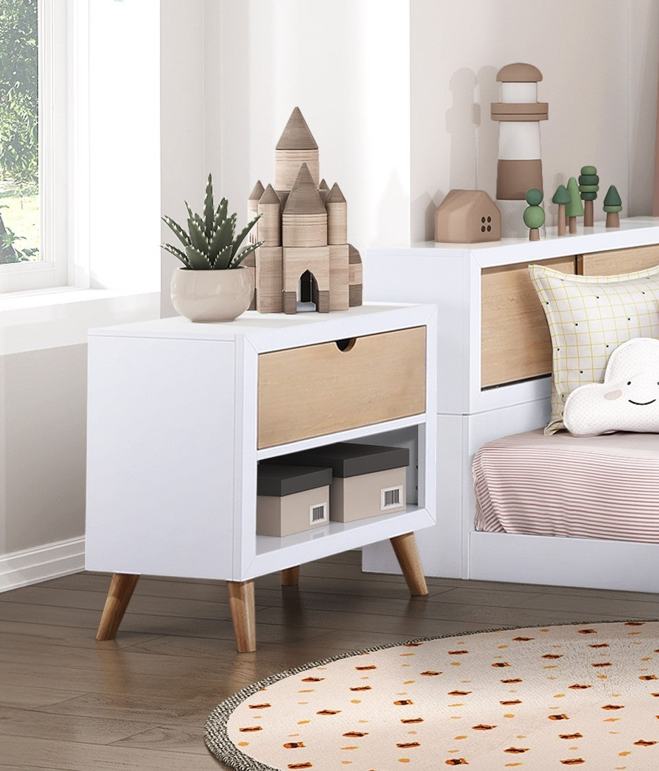 Providing the perfect landing pad for your child’s bedroom, the Asker Collection is a fun and functional addition to their space. The two-tone white and natural finish of the pine veneer is paired with the mid-century modern design to create a classic profile. The nightstand features a neutral finish on the top drawer, with an open display shelf below. A grooved hand opening centers the drawer front serving as an easy access point for drawer extension.
