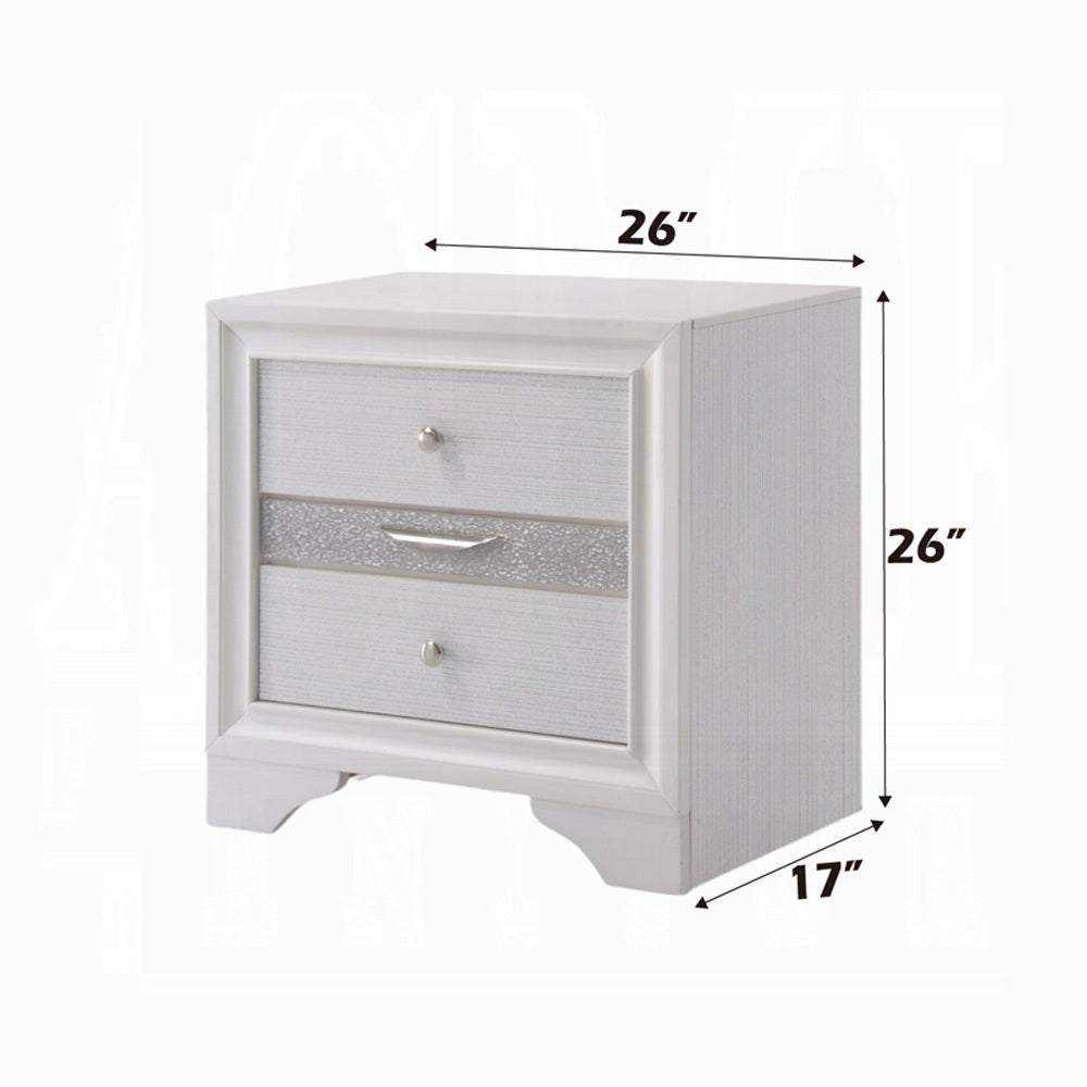 The nightstand offers a sophisticated look, clean lines, and contemporary style. This white nightstand features three drawers, with the middle drawer being a felt-lined jewelry drawer with compartments so that favorite accessories including rings, earrings, bracelets, watches, and necklaces organized and easily accessible, and the front panel with crystal-like inserts. Add this nightstand to your bedroom to provide an elegant style that will bring you a perfect sleek design.