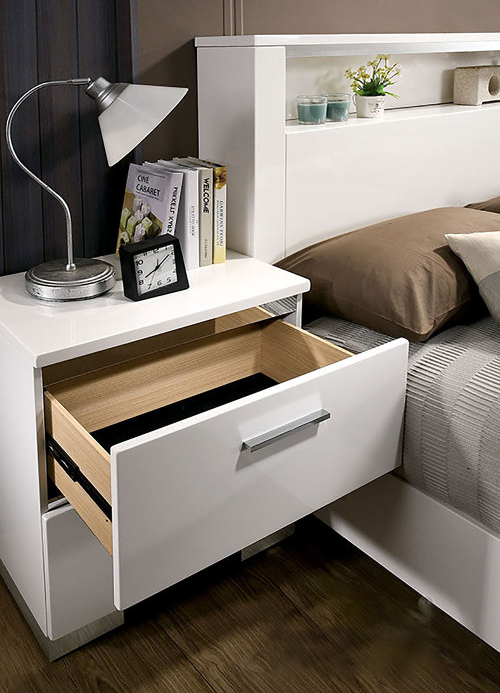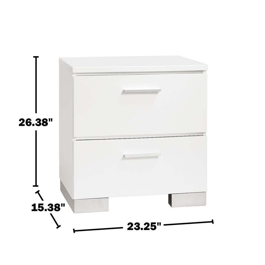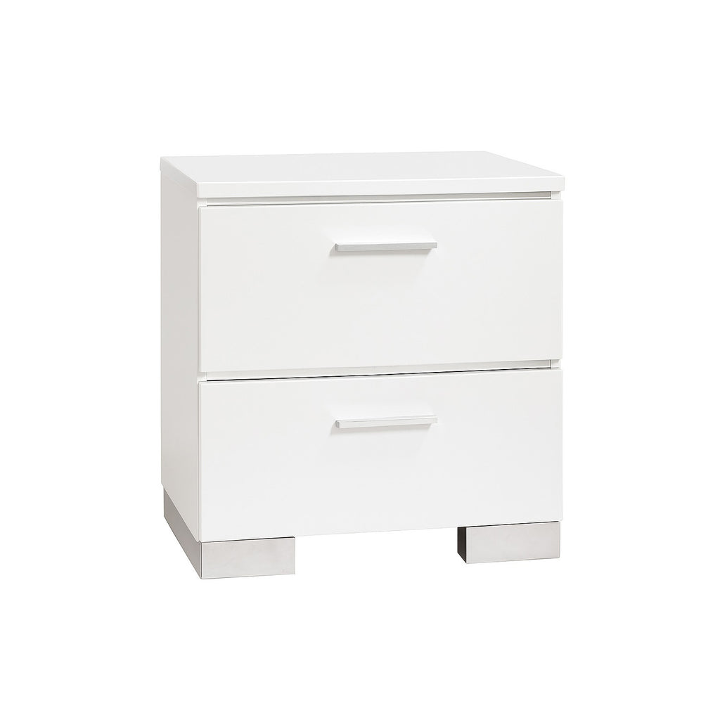 This Modern White Nightstand is the perfect blend of style and functionality. With its sleek, white finish and chrome-finished legs, it provides a contemporary and elegant addition to your bedroom. The built-in USB charger offers convenience, allowing you to charge your devices while keeping your nightstand neat and clutter-free. Two spacious drawers offer plenty of room for your belongings, making this nightstand a practical and stylish solution for modern living.