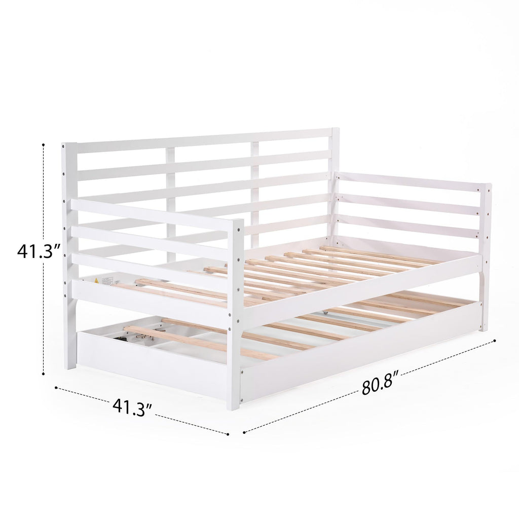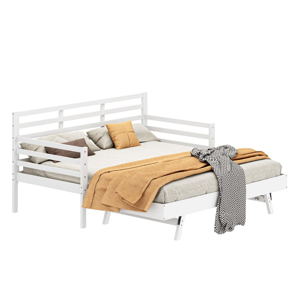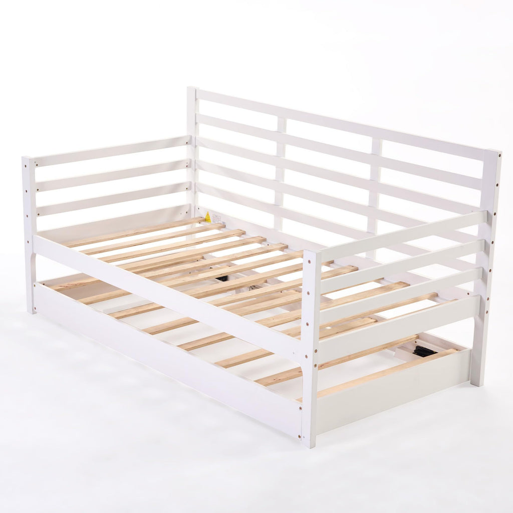 - Clean white finish complements modern, farmhouse, or coastal decor. Functions as sofa by day, two beds by night.