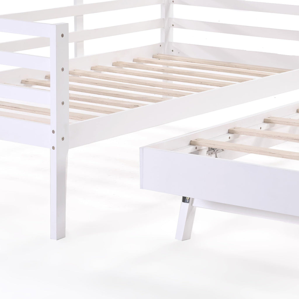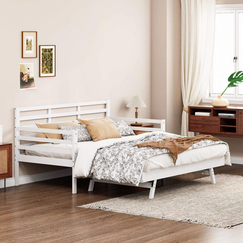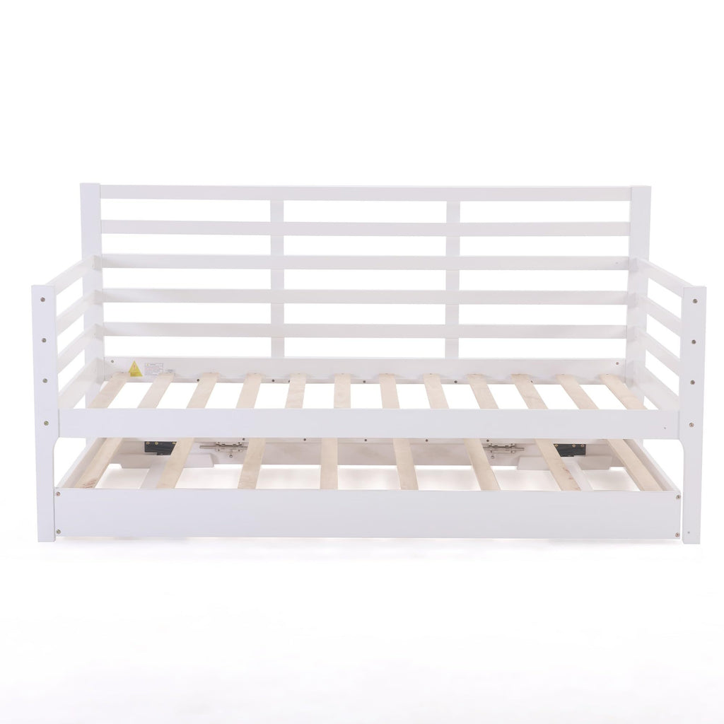 - Clean white finish complements modern, farmhouse, or coastal decor. Functions as sofa by day, two beds by night.