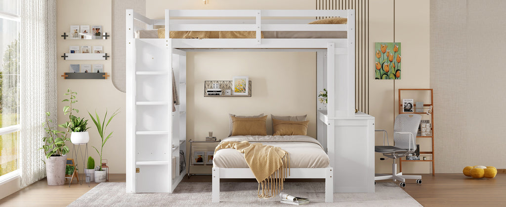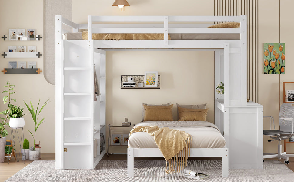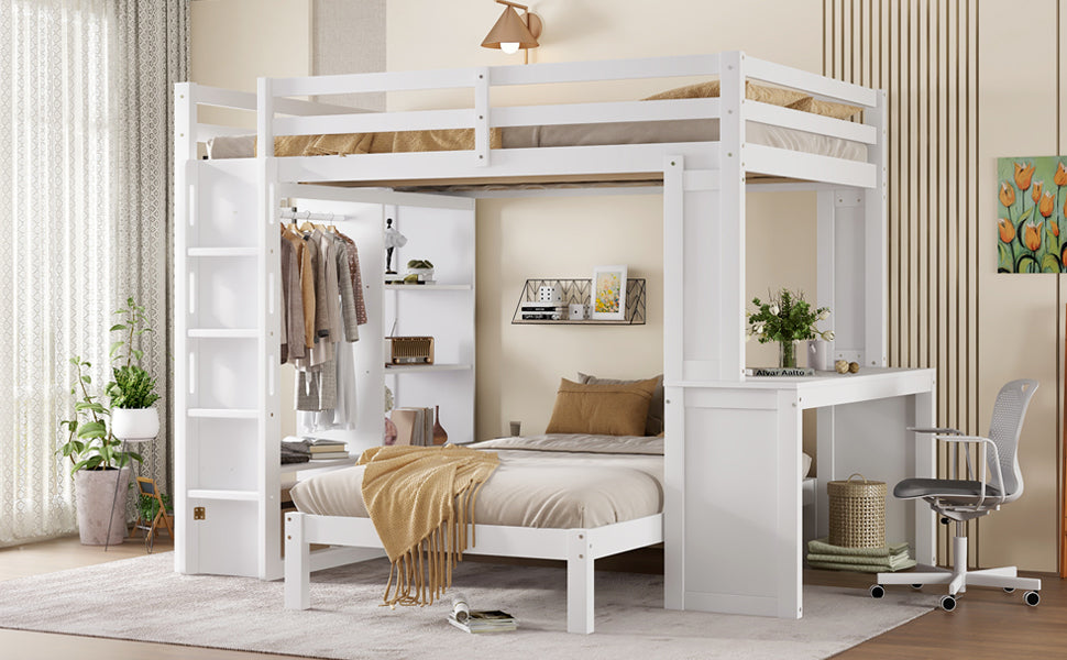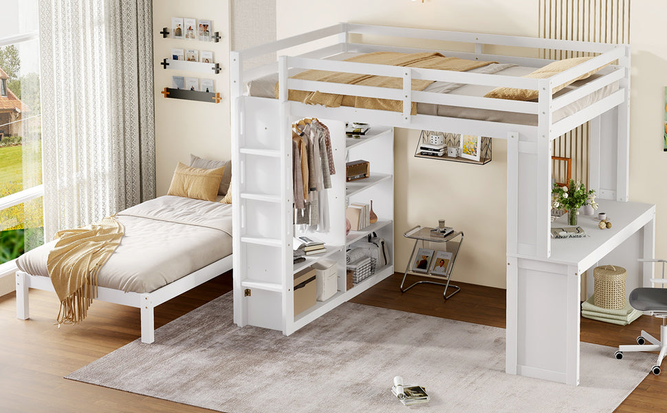 Maximize your space with this Queen Loft Bed, featuring ample built-in shelves and a wardrobe for ultimate organization. A versatile integrated desk provides a dedicated study or workspace, while the dismountable lower bed offers flexible sleeping arrangements or an open activity area. Crafted from solid wood with full-length guardrails, this white loft bed ensures both durability and safety for any bedroom, dorm, or guest room.