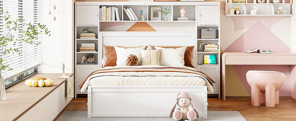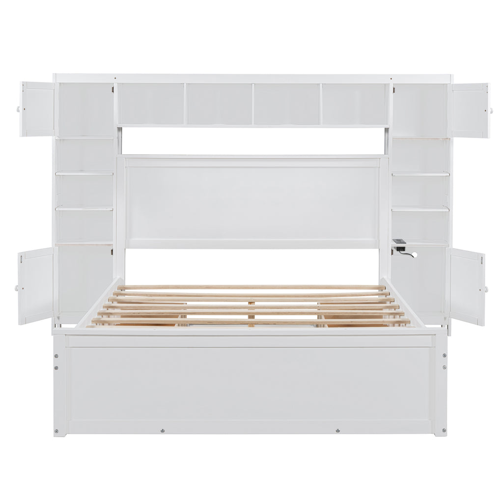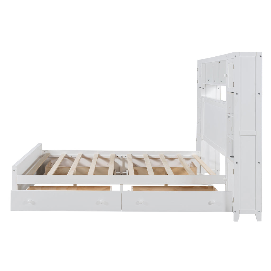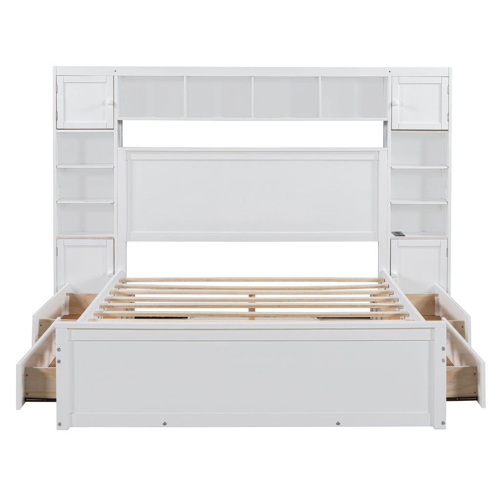 Experience regal comfort with our Solid Wood Queen Bed, featuring built-in outlets for ultimate modern convenience. This white platform bed offers extensive storage with 4 smooth-gliding drawers and an integrated headboard boasting 10 shelves and 4 cabinets. Elevate your bedroom with its sturdy craftsmanship, luxurious design, and smart organizational solutions for a truly connected sanctuary.