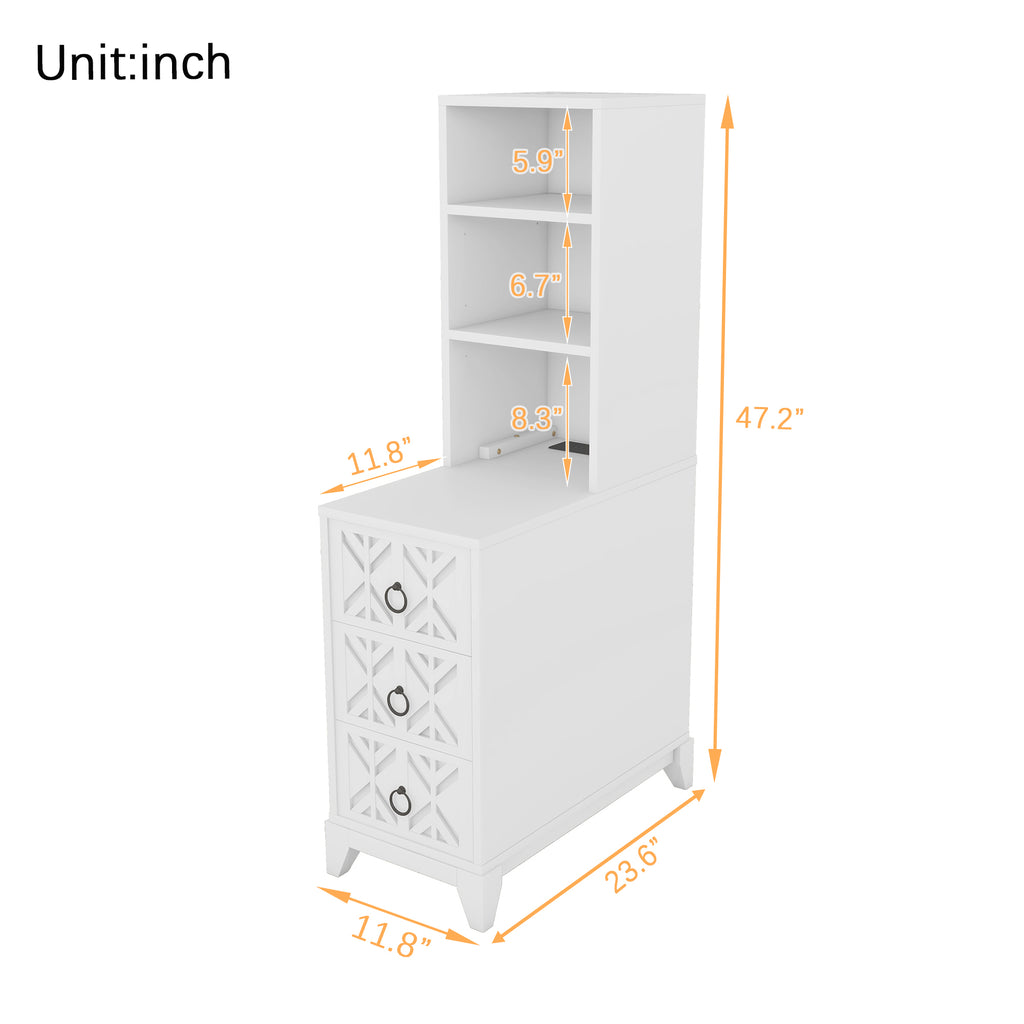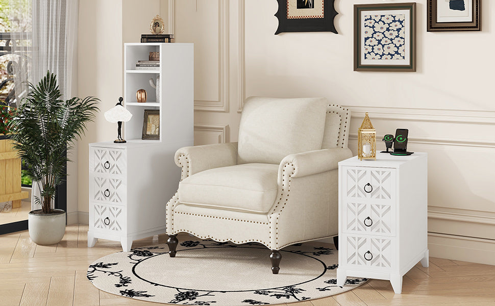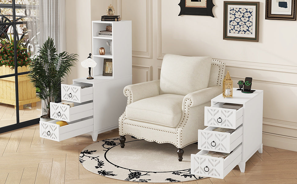 White Tall End Corner Side Table: 3 Drawers, 2 Open Shelves for Bedroom