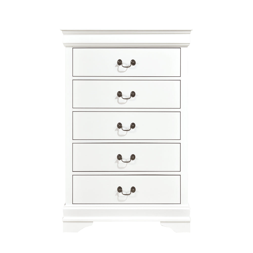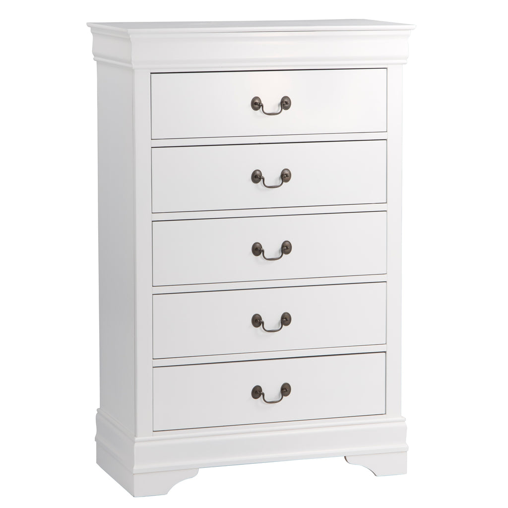 Traditional in design and modest in scale, the elegant Collection takes its design inspiration from the classic Louis Philippe styling. The Okume veneer of the chest is paired with a white finish and is accentuated by antique brass tone drop handles.