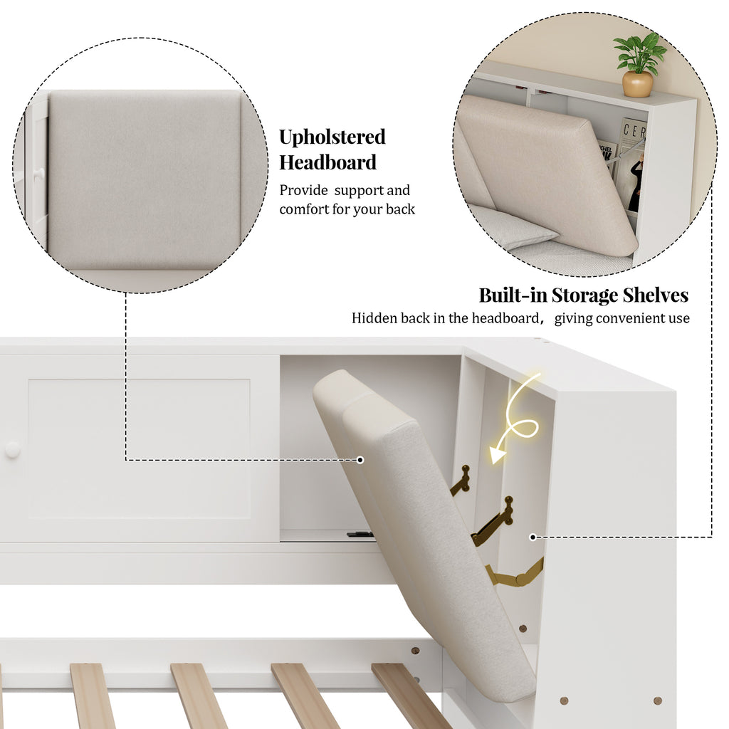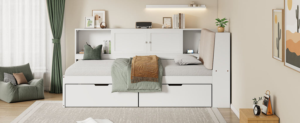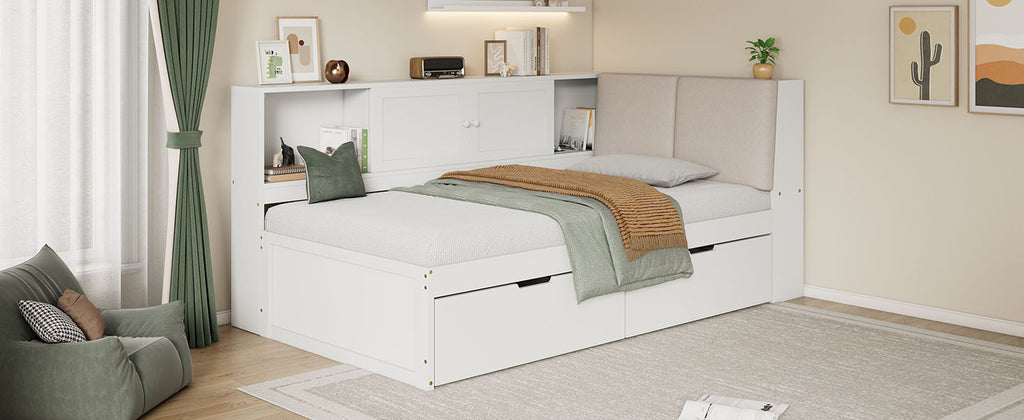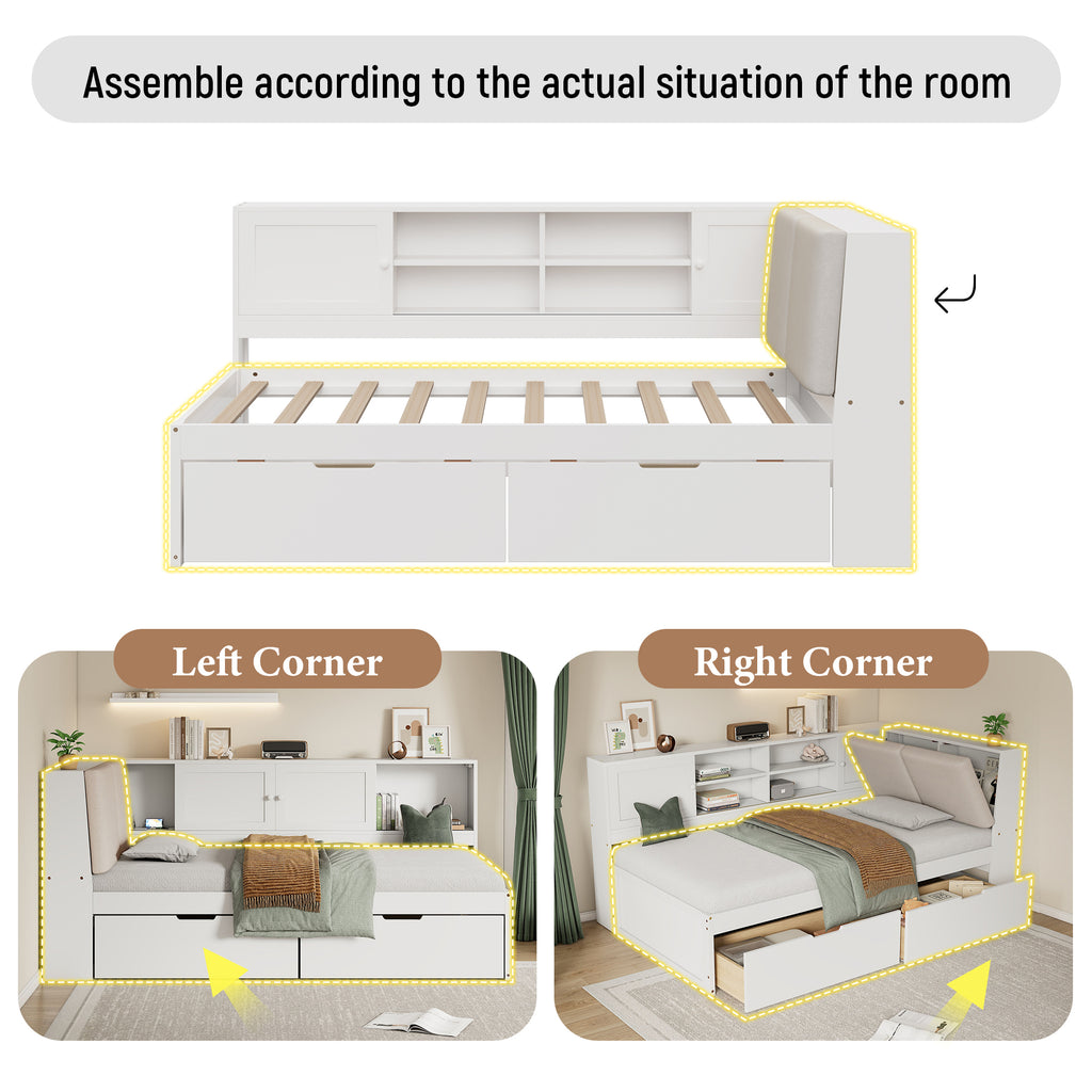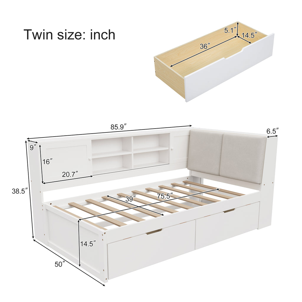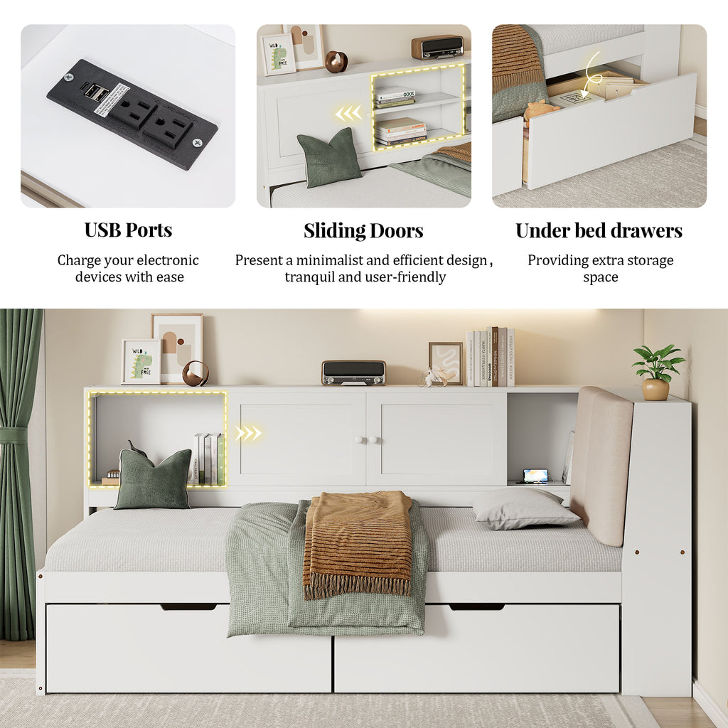Maximize space and style with this Modern Minimalist Twin Wood Bed Frame, featuring an L-shaped bookcase, two storage drawers, and hidden headboard compartments. Crafted from durable solid pine wood and MDF, it offers superior longevity and a robust 550 LBS capacity. Enjoy ultimate convenience with a built-in charging station and sleek sliding barn doors for a clutter-free, organized bedroom.