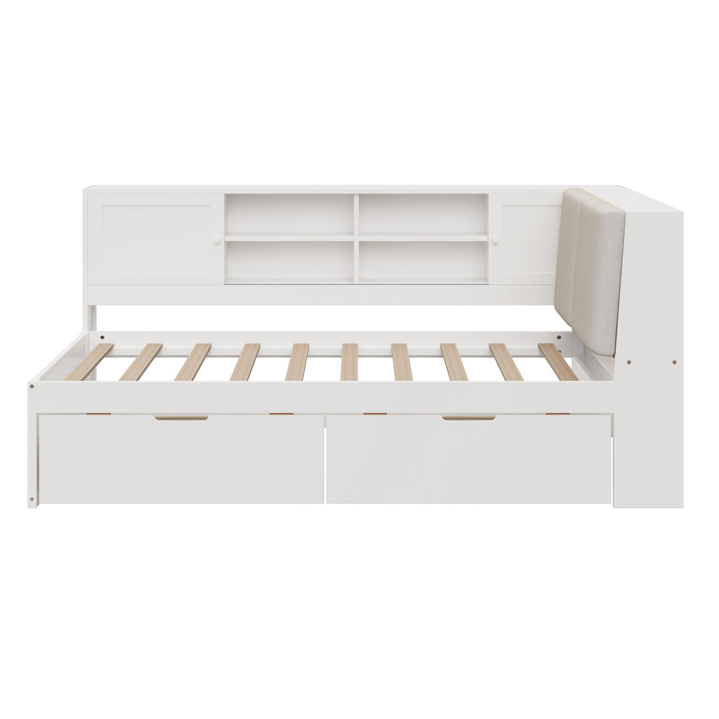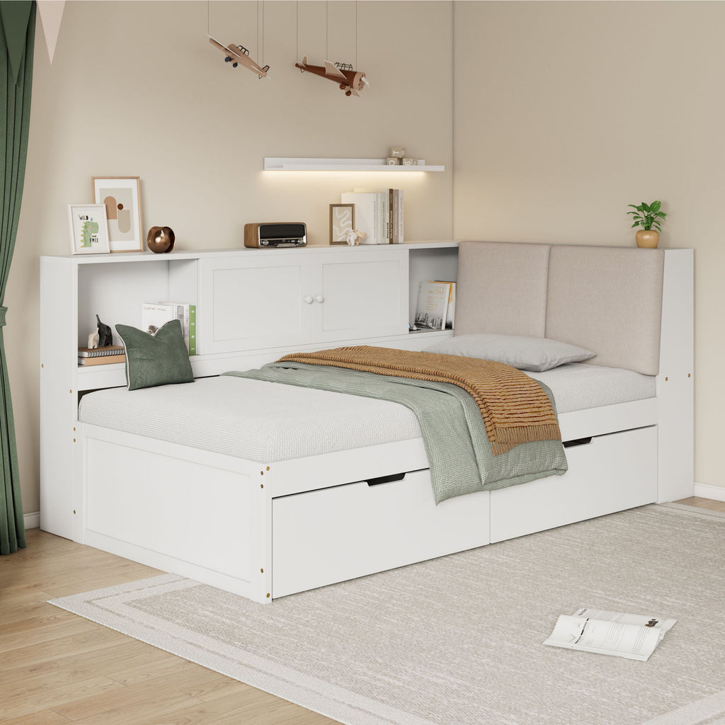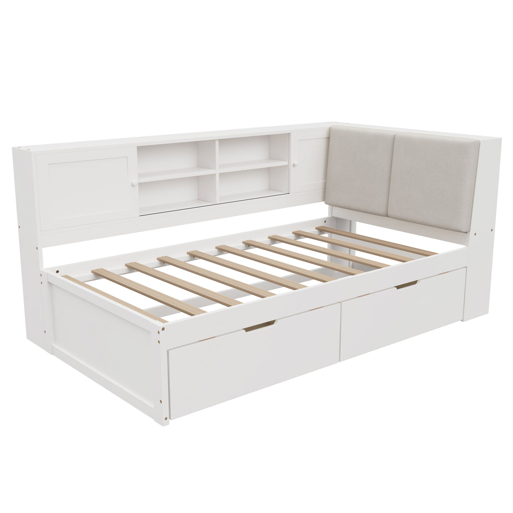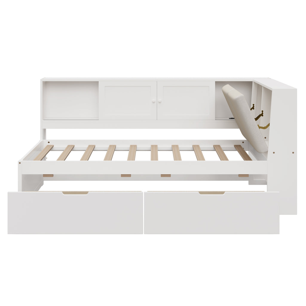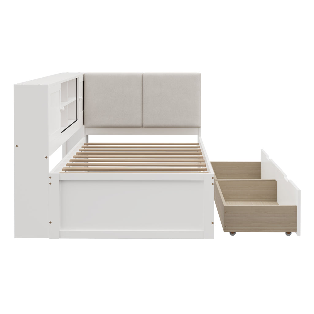 Maximize space and style with this Modern Minimalist Twin Wood Bed Frame, featuring an L-shaped bookcase, two storage drawers, and hidden headboard compartments. Crafted from durable solid pine wood and MDF, it offers superior longevity and a robust 550 LBS capacity. Enjoy ultimate convenience with a built-in charging station and sleek sliding barn doors for a clutter-free, organized bedroom.