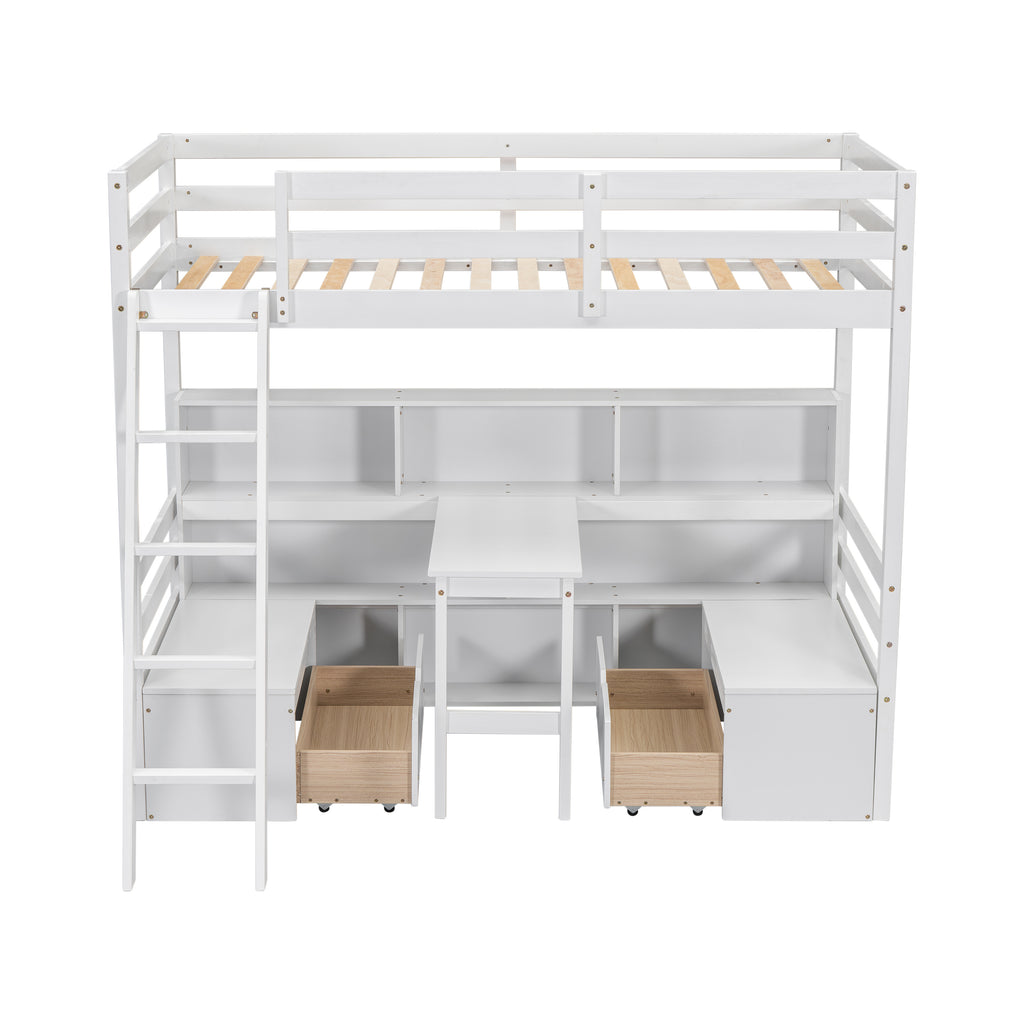 Maximize space with our Modern White Twin Loft Bed, featuring a sturdy pine wood frame, integrated desk, and storage for an organized bedroom. This multifunctional design eliminates the need for a box spring, offering a complete study and sleep solution. Perfect for kids' rooms, its timeless style and smart features create an efficient, stylish haven.