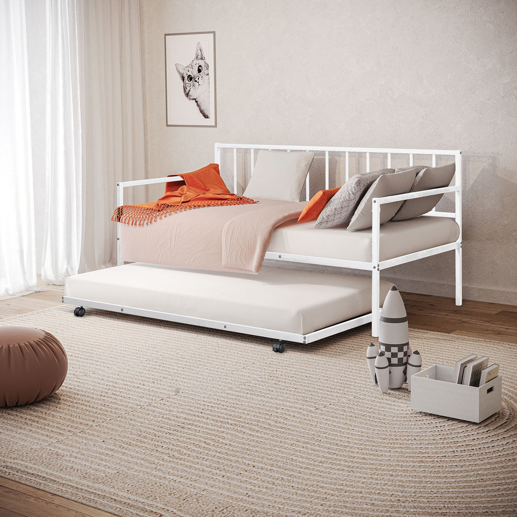 Contemporary, sleek white metal daybed with a built-in trundle beneath. Black metal frame, clean and minimalist styling.