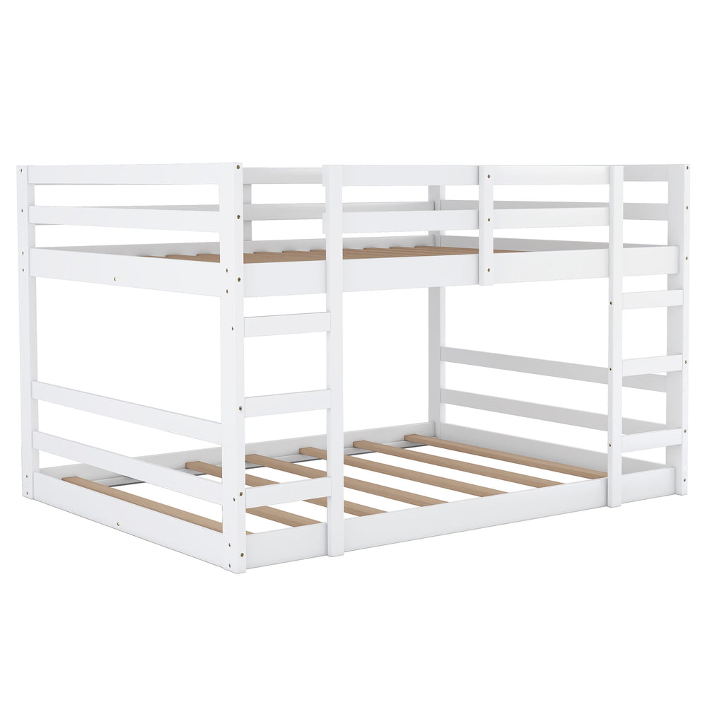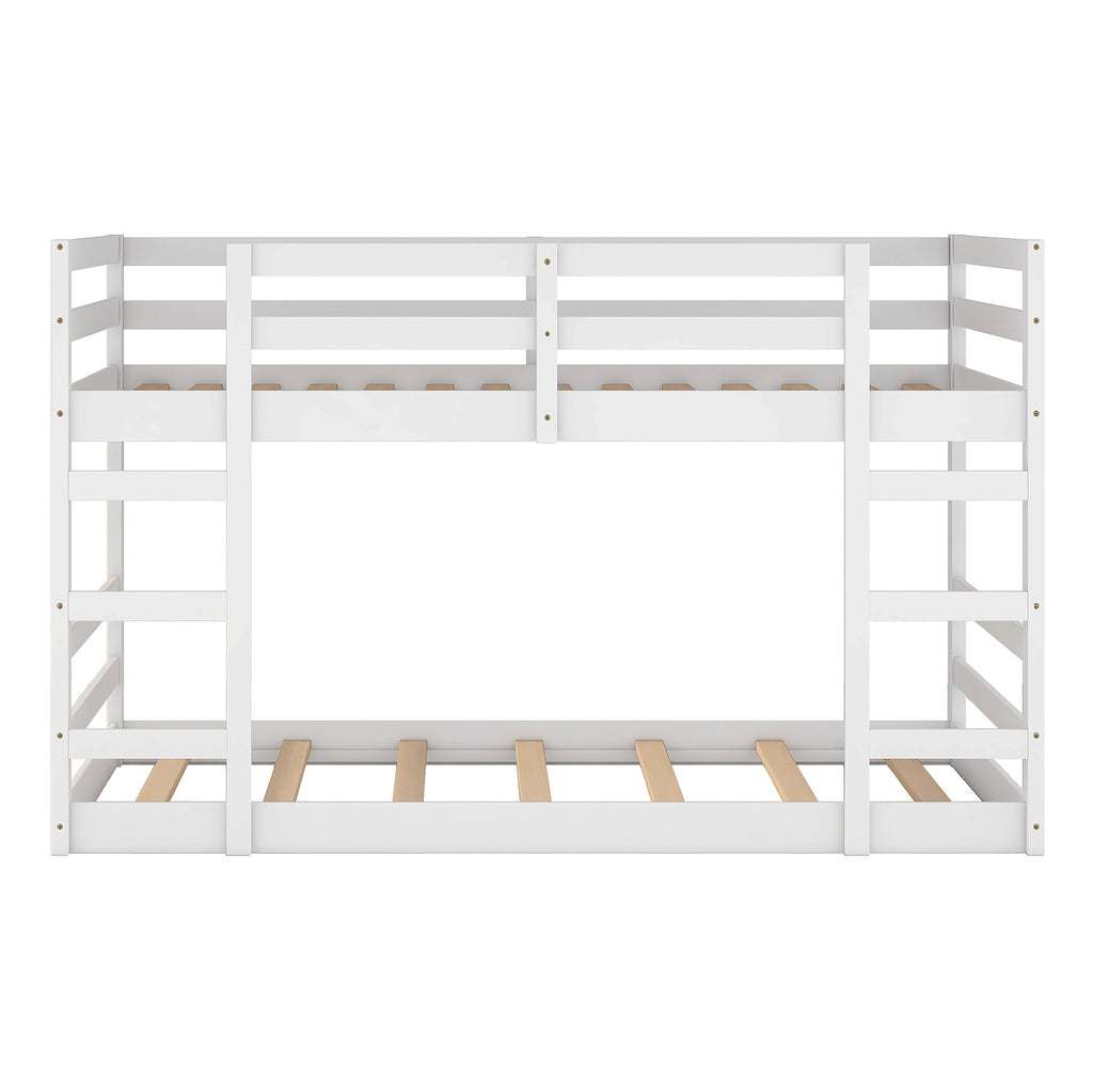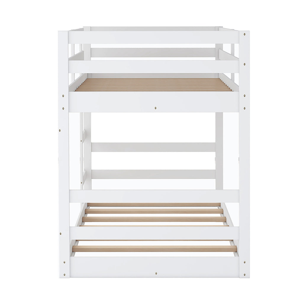 Maximize space with this sturdy white twin over twin bunk bed, crafted from solid pine wood for lasting durability and safety. Featuring full-length guardrails and a robust frame, it ensures a secure sleeping environment for your children. Its elegant design and clean lines seamlessly blend with any bedroom decor, making it a perfect, space-saving solution.