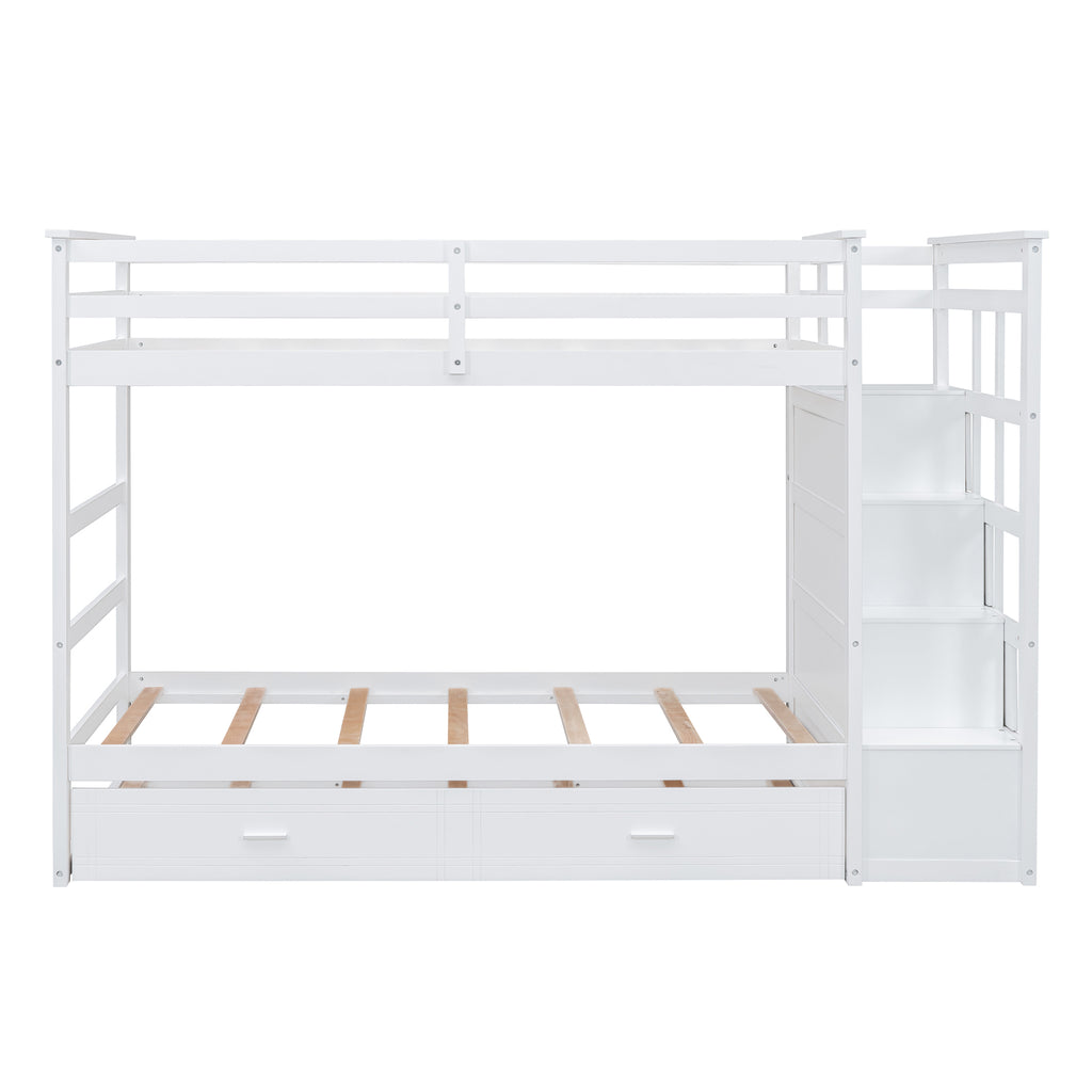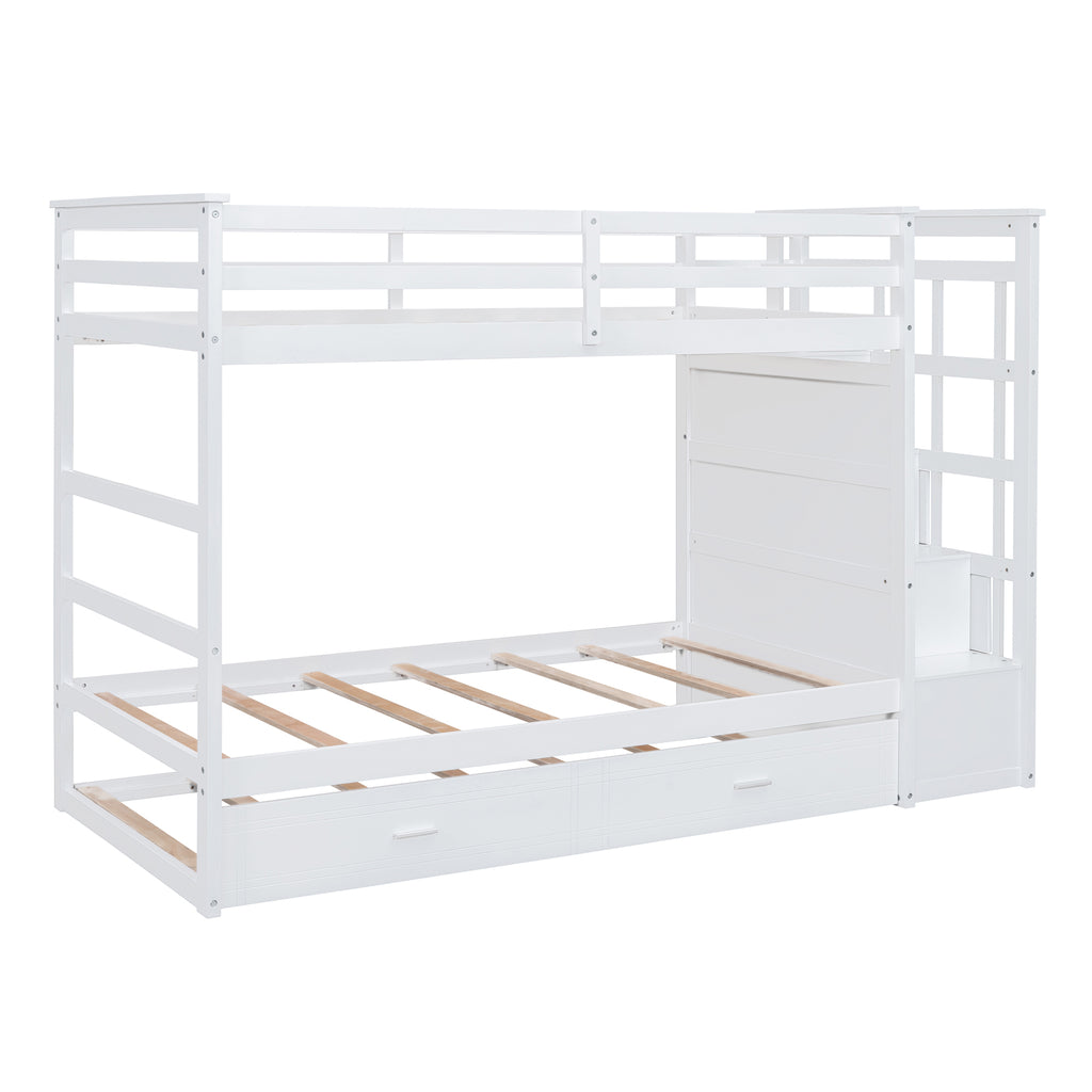 Maximize bedroom space with this elegant Twin-Over-Twin Bunk Bed, featuring a stylish white solid wood design. Enjoy ultimate organization with integrated staircase storage drawers, crafted from high-quality pine for exceptional durability. This versatile bunk bed offers a sleek, space-saving solution that perfectly complements any home decor.