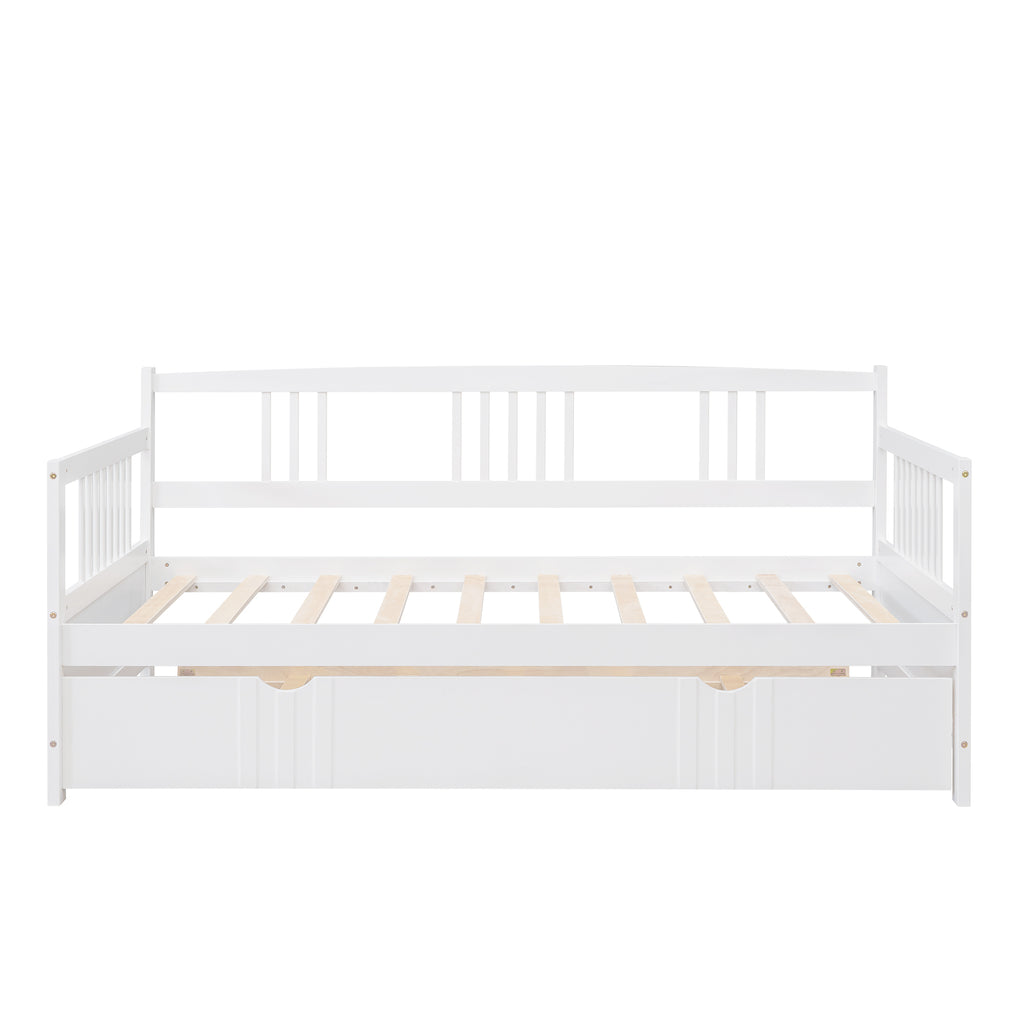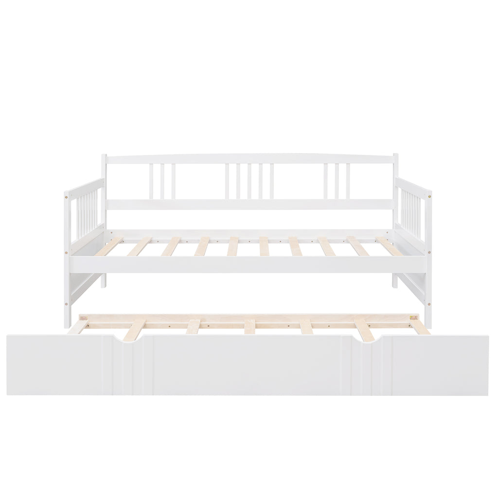 Maximize your space with this versatile twin daybed, crafted from durable solid pine wood for lasting stability. Featuring a convenient hideaway trundle, it effortlessly transforms from a stylish sofa to extra sleeping space, perfect for guests or small rooms. Enjoy timeless design and robust construction, providing comfort and multi-functionality for any home.