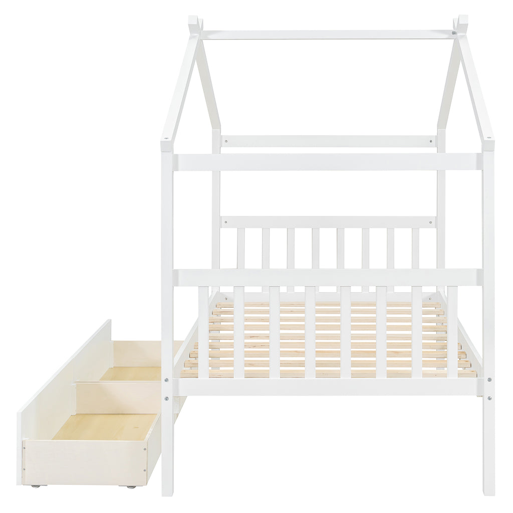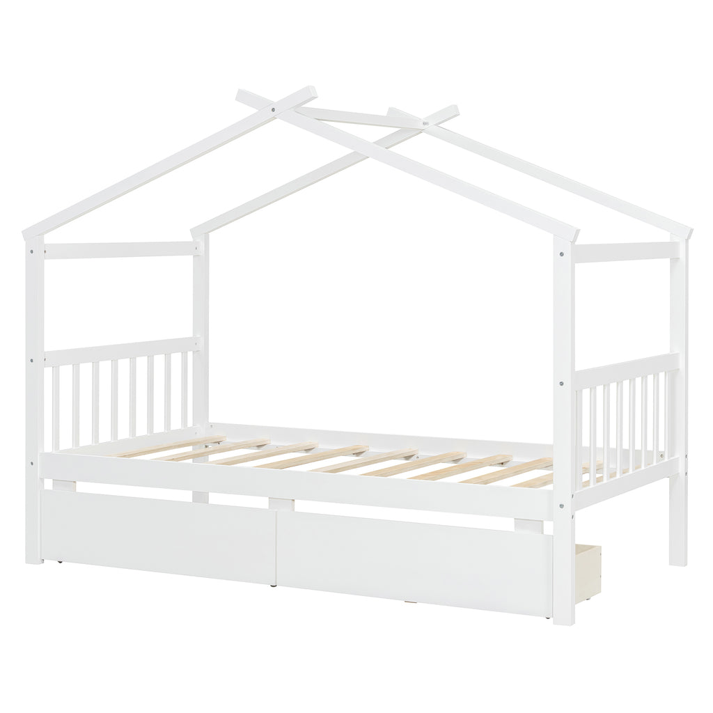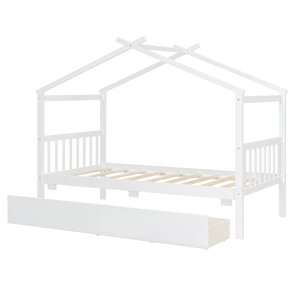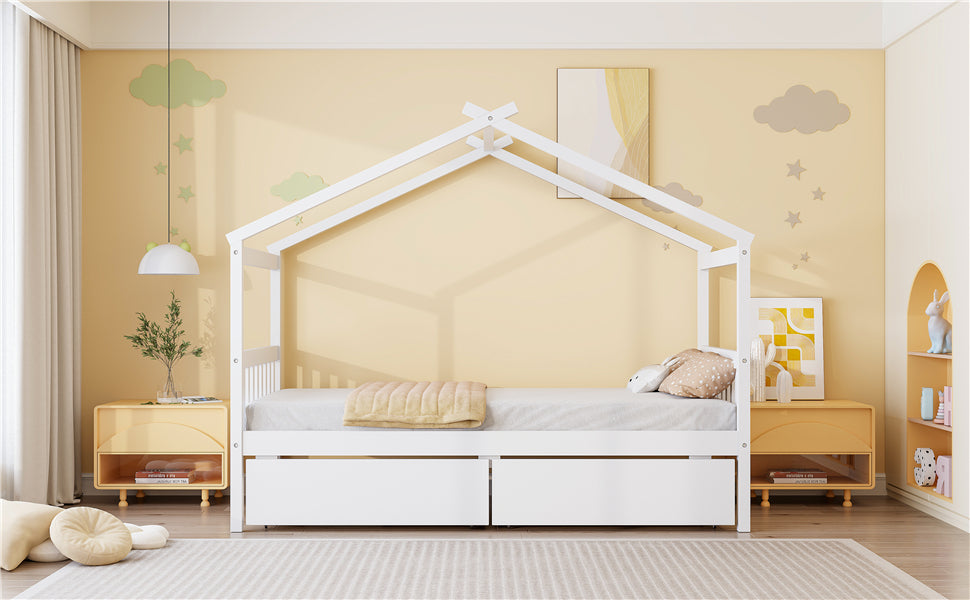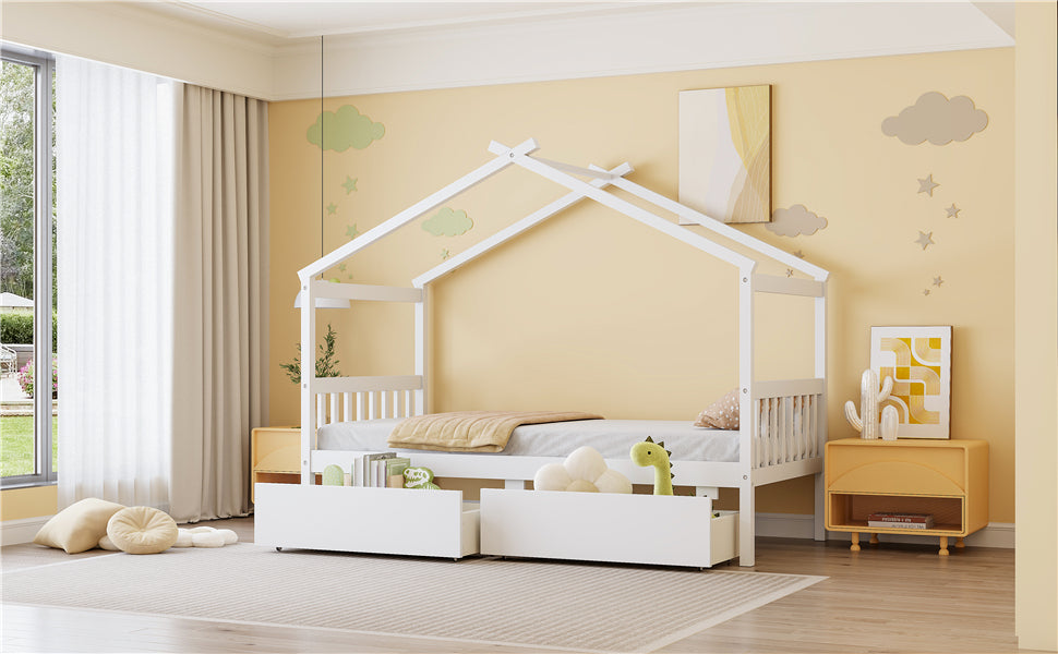 Transform your child's room with this charming Twin Size Wooden House Bed, featuring a whimsical sky roof and integrated drawers for essential storage. Crafted from solid pine wood and MDF, its durable construction ensures lasting quality and safety. This imaginative white platform bed creates a fun, organized, and secure space for dreaming and play.