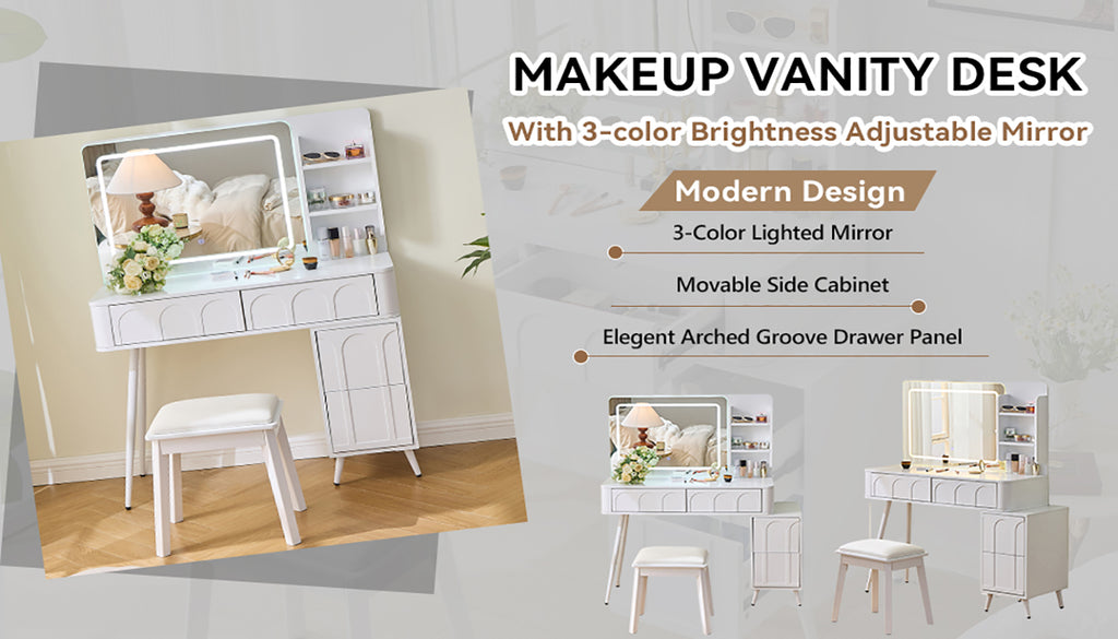 - 3-Color Lighted Mirror for Perfect Illumination: The vanity table includes a high-definition mirror with three LED light options: warm, cool, and natural. Simply touch the screen switch to illuminate your beauty routine as needed. This feature provides bright and even lighting, ensuring a flawless makeup application every time. The adjustable brightness allows you to customize the lighting to your preference, making it ideal for any lighting condition.
