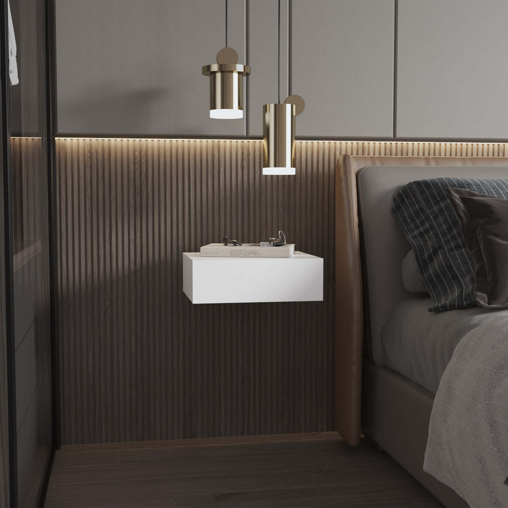 - Experience the sleek, space-saving solution of the floating nightstand's wall-mounted design, enhancing room aesthetics while providing functionality