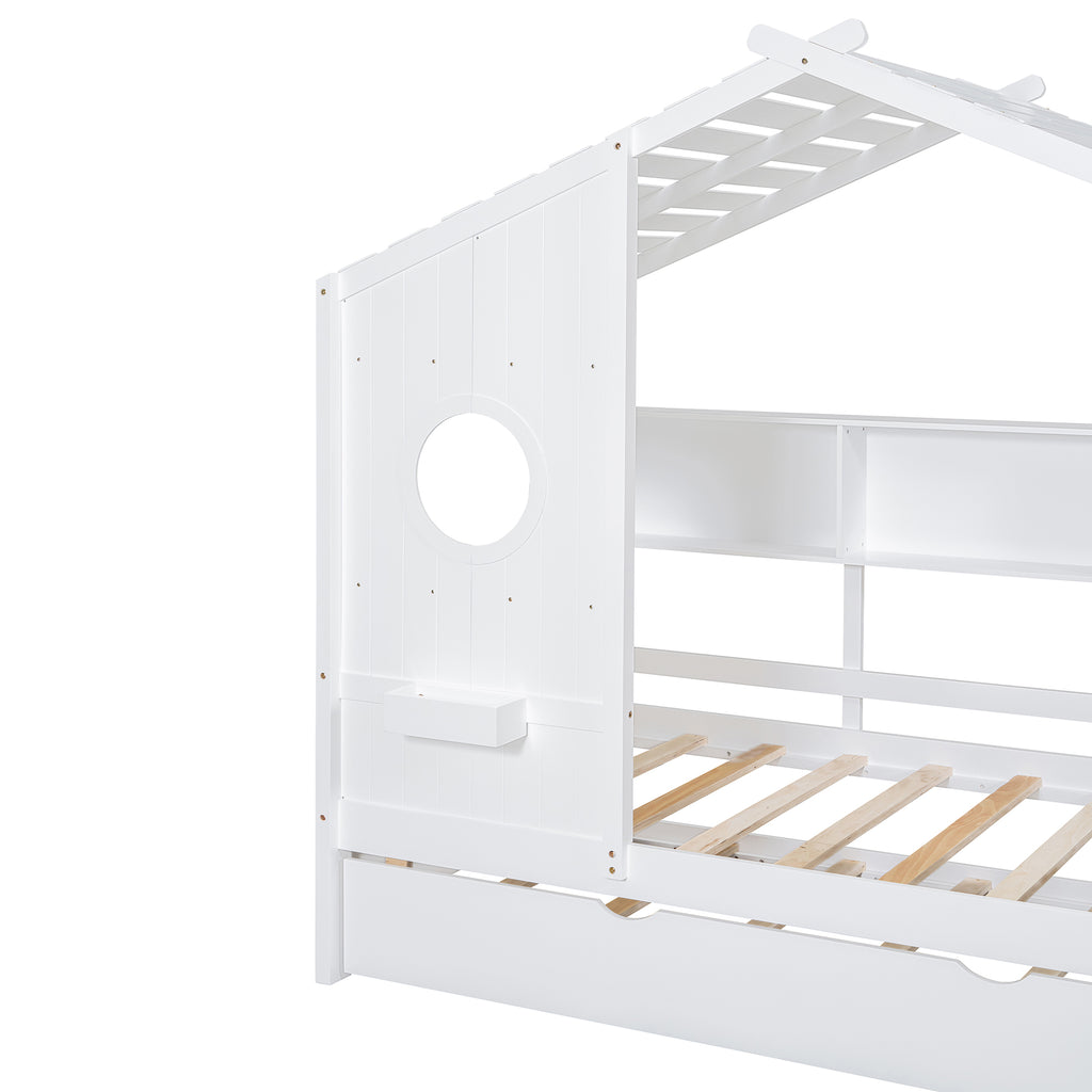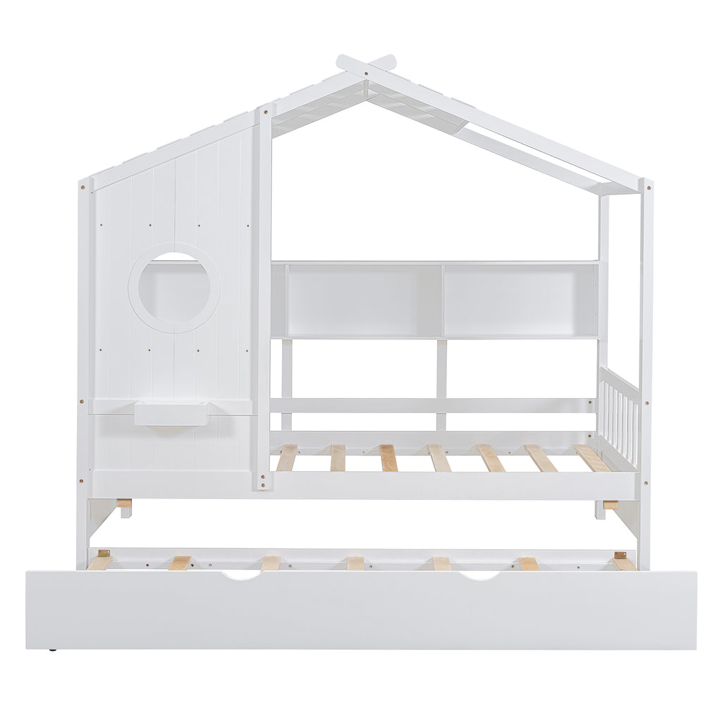 Wooden Twin Size House Bed With Trundle, Modern Design for Kids with Storage Shlef, White