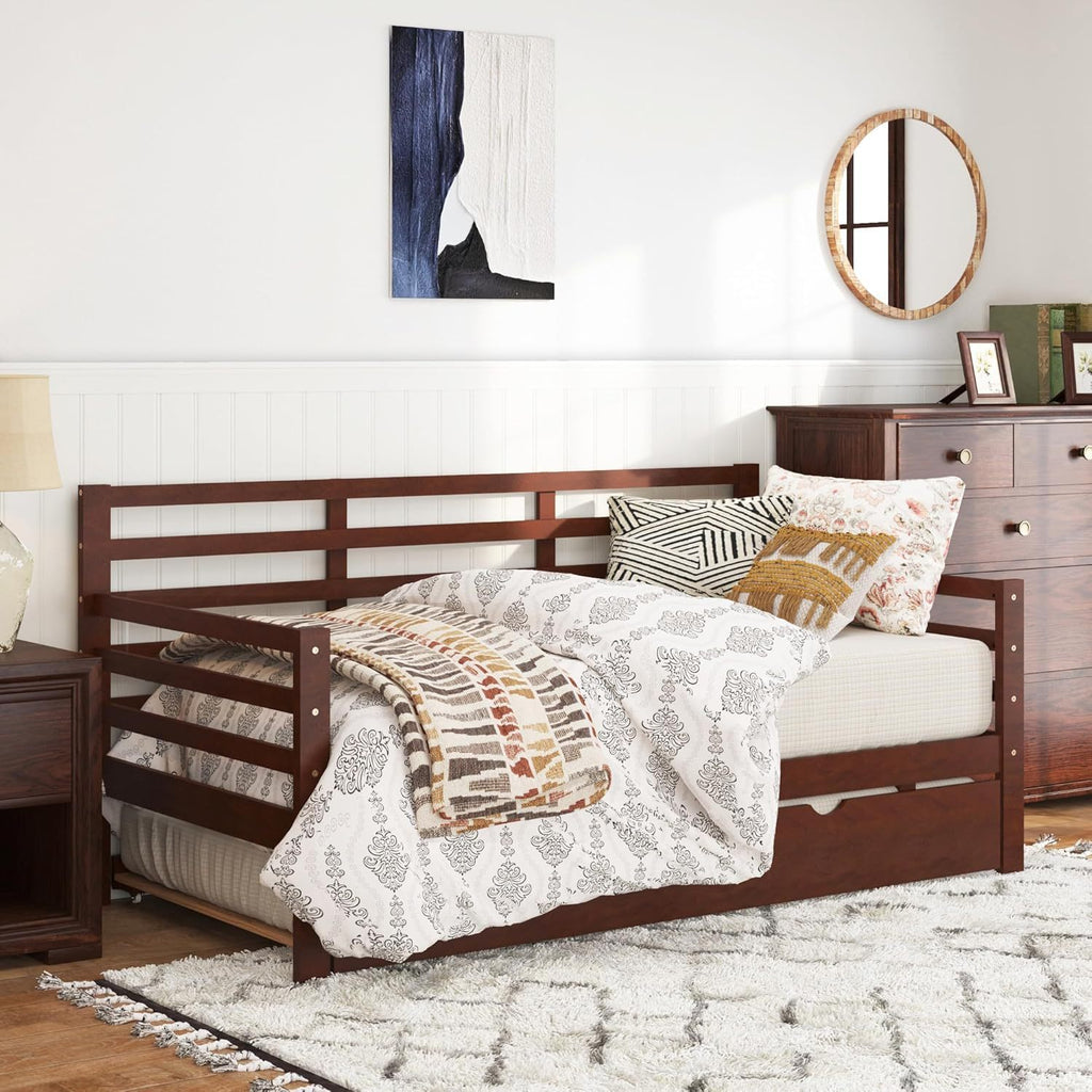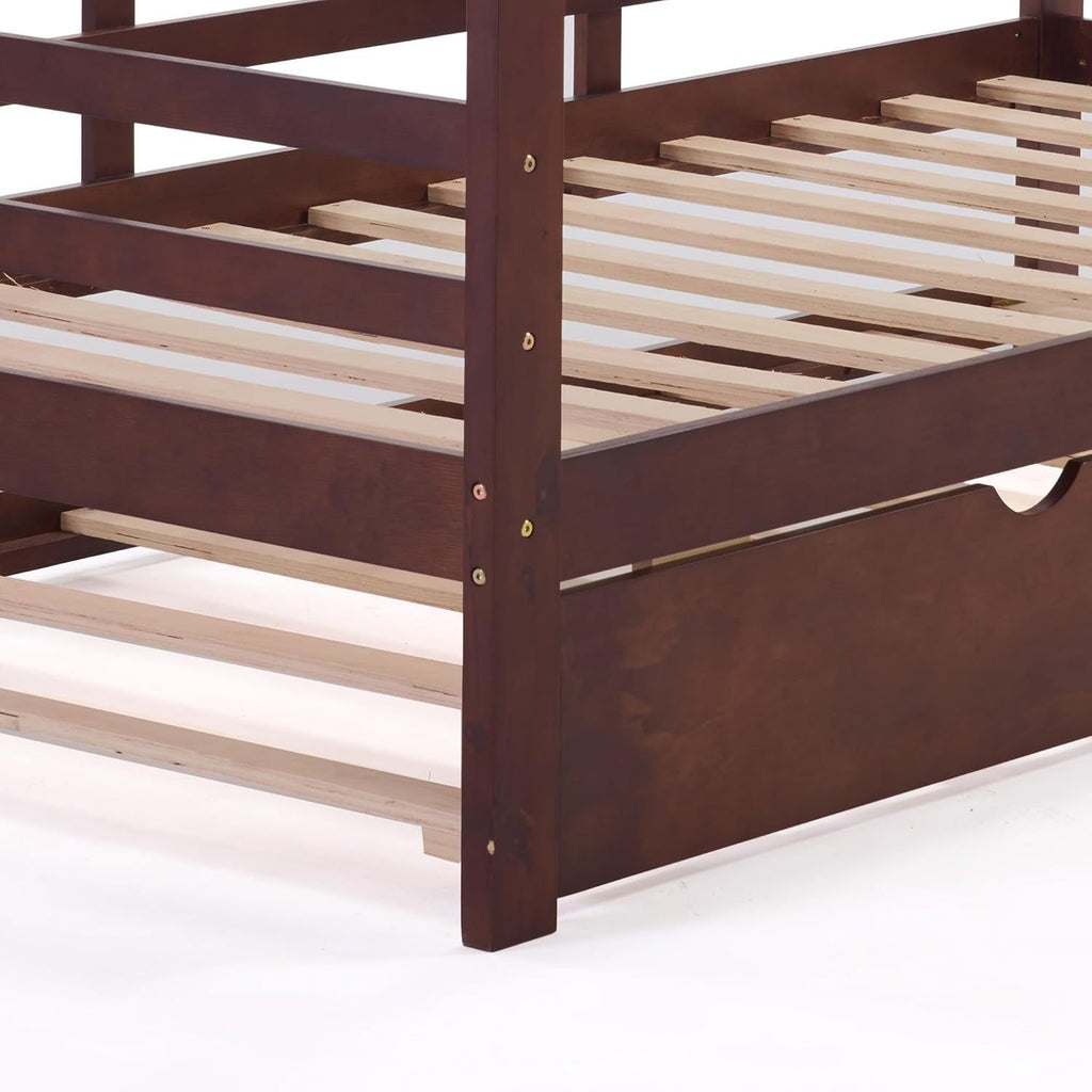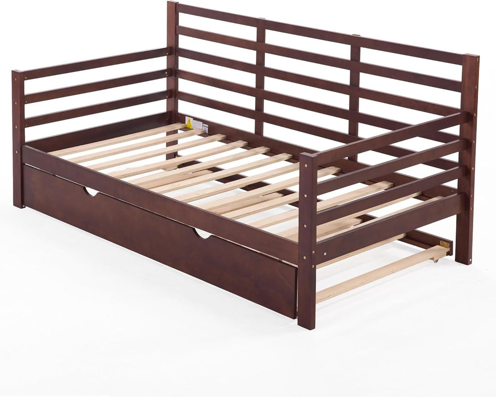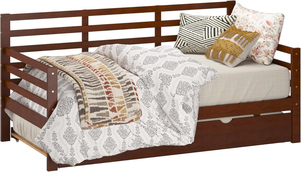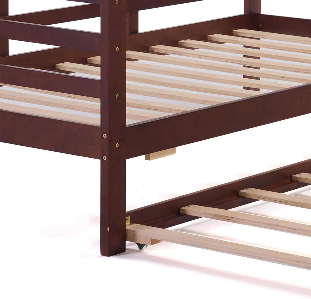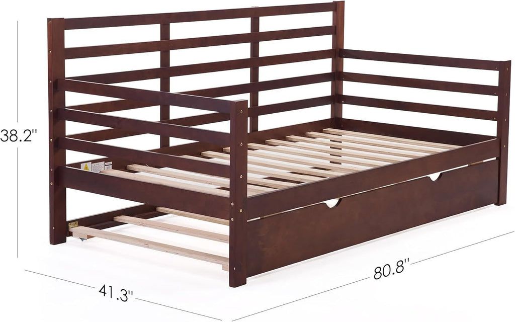 - Warm brown finish blends with farmhouse, modern, or rustic decor. Serves as a cozy sofa by day and two beds by night.