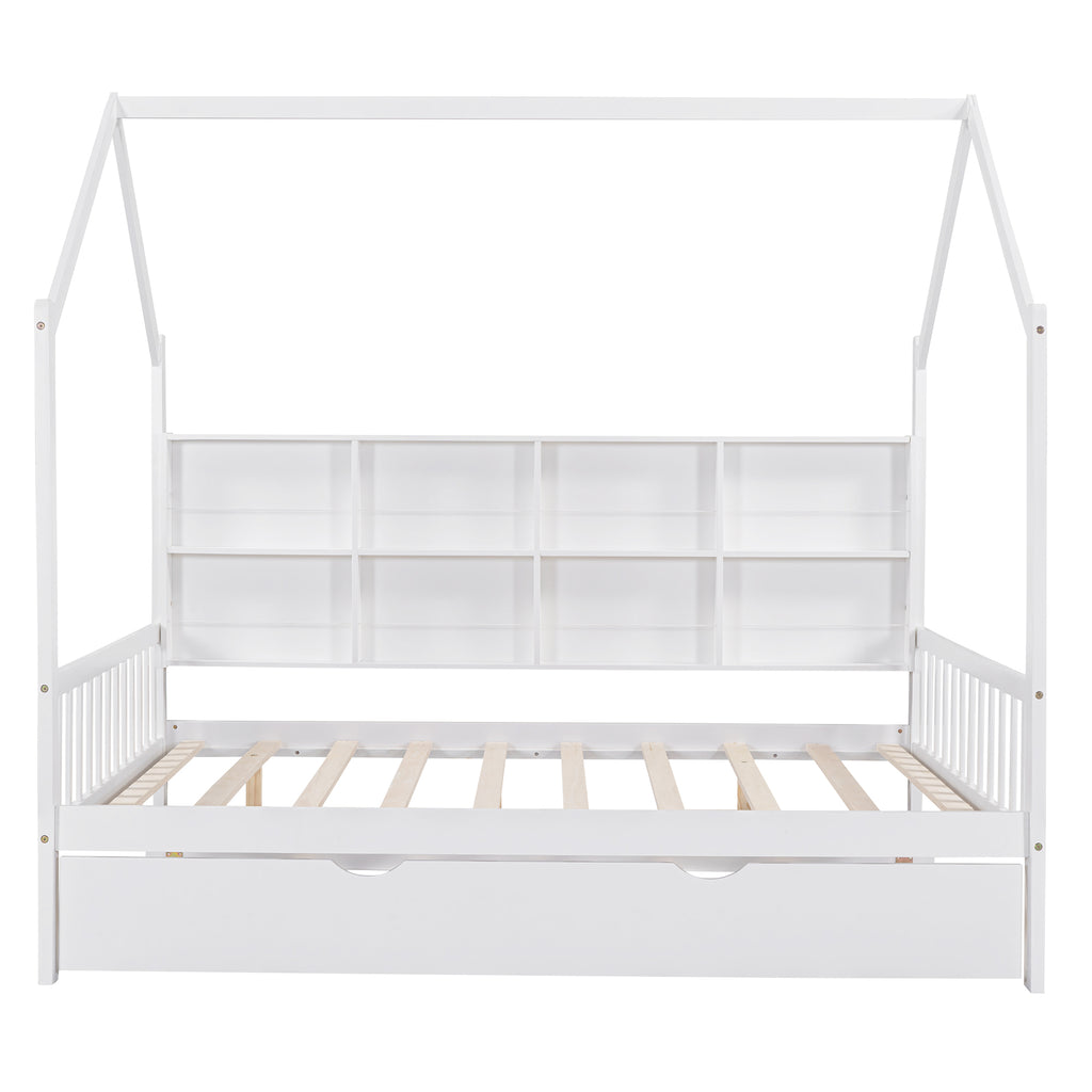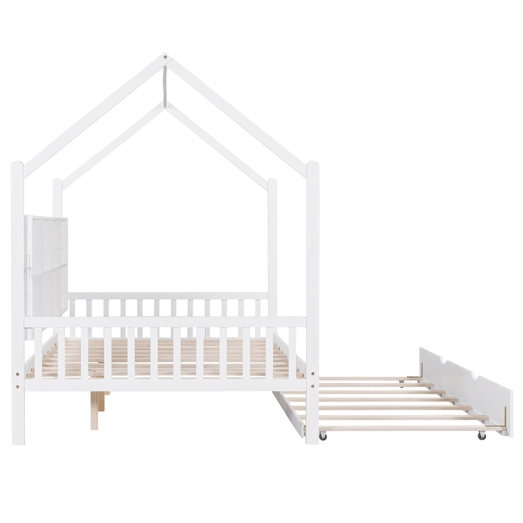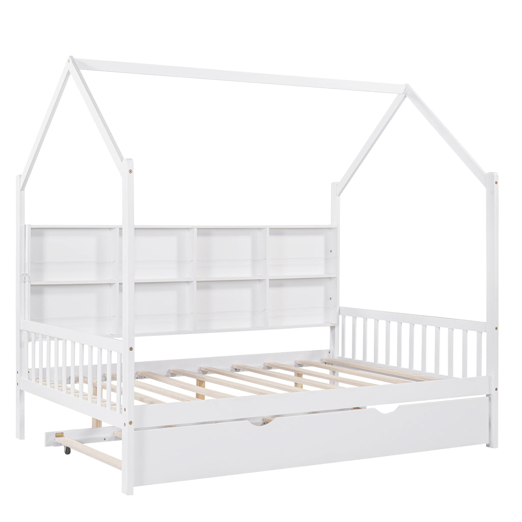 Transform bedtime into an adventure with this charming Full Size White Wooden House Bed, featuring a playful roof design perfect for imaginative play. This versatile bed includes a convenient pull-out trundle, ideal for sleepovers, and a space-saving back shelf to keep essentials organized. Crafted from sturdy pinewood, it offers a secure and cozy sleeping haven that sparks joy and declutters kids' rooms.