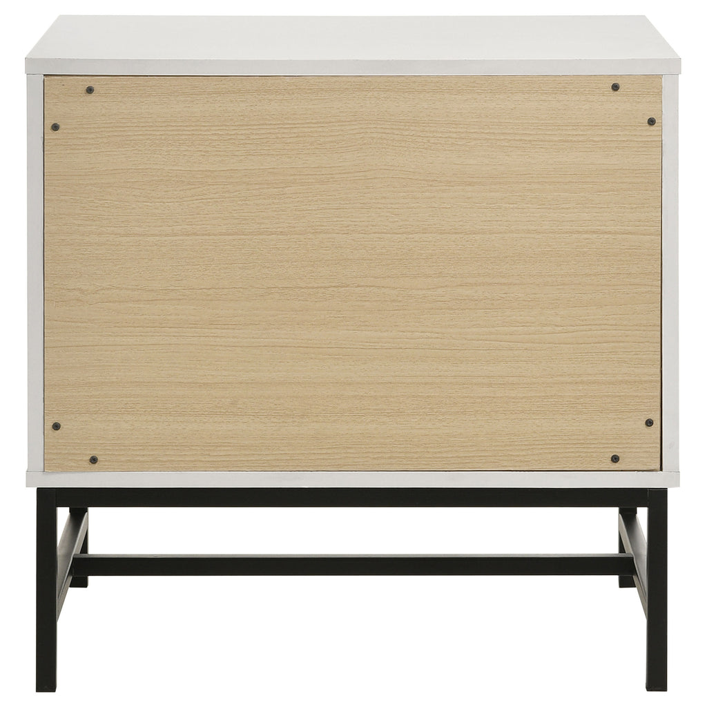 A sleek silhouette and crisp white finish give this two-drawer nightstand a clean, contemporary look, perfect for modern bedrooms. Bold black accents and hardware provide striking contrast, adding depth and visual intrigue to its functional, stylish design.